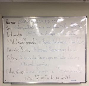 Em julho de 2017, em mais uma atuação minha num Júri Popular, no Fórum Criminal Ministro Mario Guimarães, no bairro da Barra Funda, em São Paulo – Capital, tivemos a oportunidade de, pela primeira vez, estarmos juntos, eu como defensor juntamente com outro colega, amigo e irmão e Luca Parentoni e Bruno Parentoni como estagiários, com seus nomes registrados na lousa do Plenário.